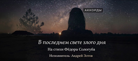 Intro: :3/4: … D/A D/A | D/A | :4/4: D :3/4: … B B | B | :4/4: B :3/4: … A A | A | :4/4: A … G# G# G# | G# G# G# G#+ C#5 | C#5 | C# | C# :3/4: C# C# C#sus4 | C#sus4 :4/4: C# | C#sus2 | C# | … … … … D A D В последнем свете злого дня, B B7 Em В паденьи сил, в затменьи Бога, A C#m Перед тобой Моя дорога. G# C#m Приди ко Мне, люби Меня. A Dm Приди ко Мне, люби Меня. --Переход в тональность F-- Csus4 F C7 F В мирах всё призрачно и тленно, D D7 D Но вот Я заповедь даю, Eb Eb7 Abm Она вовеки неизменна: Eb Abm Люби Меня и жизнь Мою. Проигрыш: :4/4: E | Am Am Am Amsus4 --Переход в тональность D-- Amsus4 D A D Я – всё во всём, и нет Иного. B B7 B Во Мне родник живого дня. Cm Cm7 Cm6 Во тьме томления земного Dsus4 Gm D Gm Я – верный путь. Люби Меня. Eb Abm Я – верный путь. Люби Меня. E Am Я – верный путь. Люби Меня. Кода: :4/4: E Am | Amsus4 | A | Asus2 | A | A D | D | Bm | F# | C# | F# | F# F#6 | F# | F# | F#maj | F#6 :6/4: C#